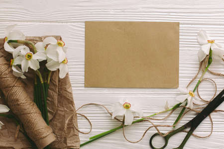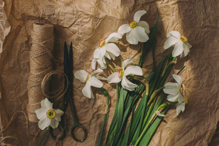 Beautiful white daffodils, scissors, twine in sunny light on rustic brown paper background, top view. Stylish spring flowers rural still life. Happy Mothers day. Happy Women's day.