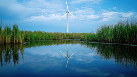 A serene landscape showcasing a wind turbine reflecting in calm water, surrounded by lush green grass, under a bright blue sky with fluffy clouds.