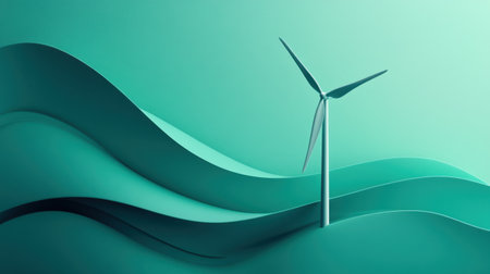 This abstract image showcases a wind turbine emerging from soft teal waves, embodying the essence of renewable energy with a modern and minimalist design.