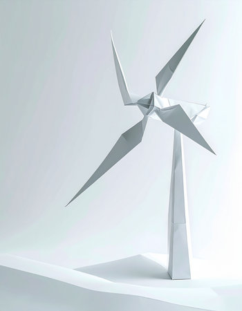 A minimalist, low-poly wind turbine stands as a symbol of clean, sustainable technology. This 3D render captures the essence of modern innovation and the future of renewable energy with its clean lines and simple, geometric form against a stark white background.