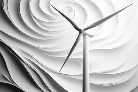A wind turbine is prominently displayed in front of a textured background of swirling paper layers, creating a striking visual representation of renewable energy.