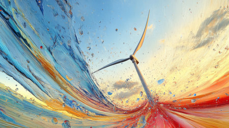 This stunning abstract artwork features a wind turbine emerging from waves of vibrant water, illustrating the harmony of nature and renewable energy in an eye-catching display.