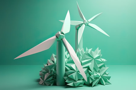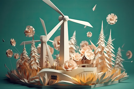 Wind turbine and alternative renewable energy. Paper art of ecology and environment concept. Eco friendly nature landscape background. AI generative