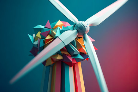 A striking image of a wind turbine set against a vibrant geometric background, illustrating themes of renewable energy and modern technology in a creative way.