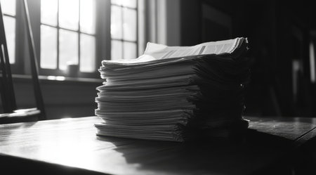 The monochrome photograph shows a neatly stacked pile of newspapers on a rustic wooden table, illuminated by soft natural light from nearby windows, enhancing the scenes warm atmosphere