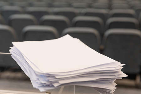Mock up, stack of papers documents in archives files with paper clips on desk at offices, business concept.
