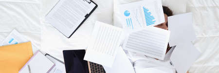 Business man or office workers with white shirt holding documents for writing on office desk, Stack of business overload paper.