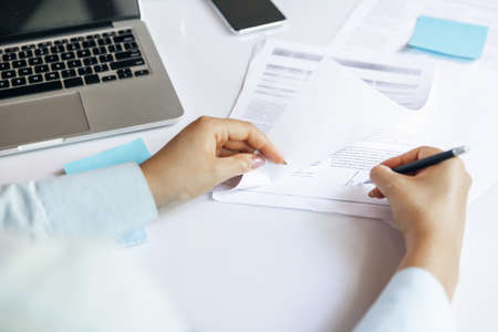 Close up of female hands signing business contract. Concept of female business, online education, professional occupation