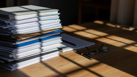 A stack of tax forms rests on a wooden table, illuminated by gentle light streaming through a nearby window, highlighting the paperwork's details.