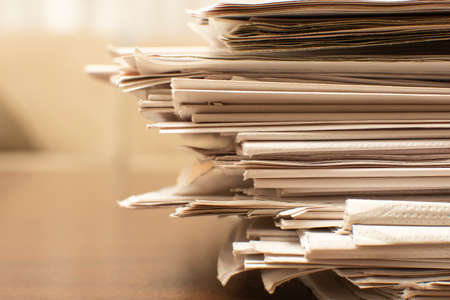 Pile of newspapers lying on the wooden table with blurred background and copy space for text. Close up of newspapers stack. Journalist concept.