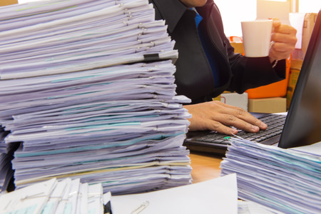 Male office workers with suit holding and writing documents and computer laptop on office desk, Stack of business overload paper.
