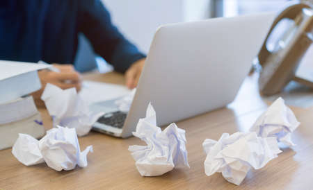 close up on crumpled paper with blur employee man working hard after reading project policy at laptop , office syndrome and busy task concept