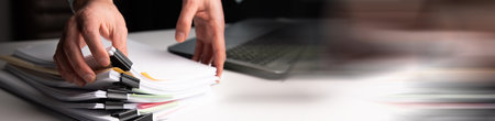 Man hand pick up Stack overload document report paper with colorful paperclip, business and paperless concept.
