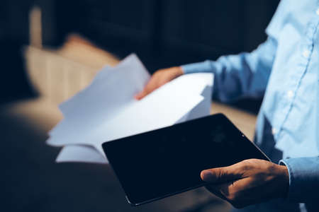 Woman reading paper documents at workplace at night. Overtime working and deadline concept