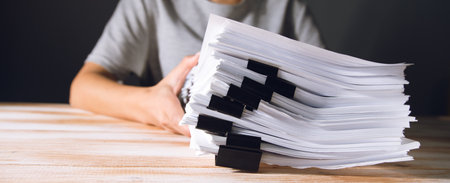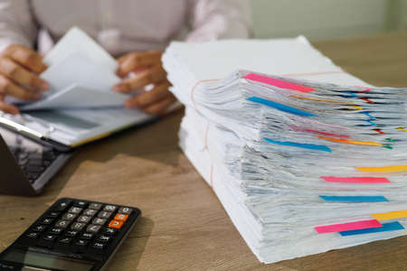 Business man or office workers with white shirt holding documents for writing on office desk, Stack of business overload paper.