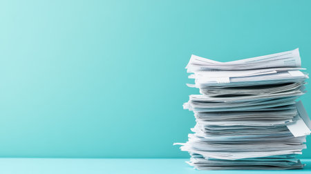 A visually striking image showcasing a pile of disorganized papers stacked against a soft turquoise background, perfect for illustrating office clutter and organization challenges.