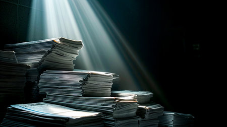 A Tall Stack of White Papers Illuminated by Soft Light on a Table Surface Creating a Dramatic Contrast in a Darkened Room