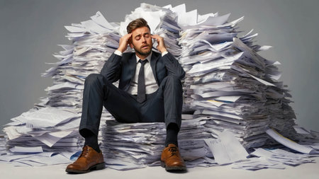 Overload work. Exhausted man in paper documents pile.