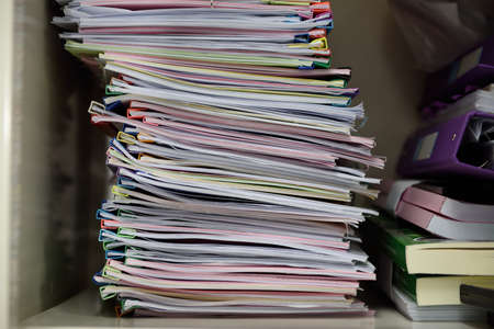 Stack overload document report paper with colorful paperclip place, business concept paperless used.