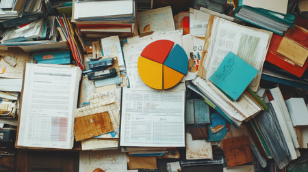 A cluttered workspace filled with papers and a colorful pie chart, representing chaos in data management. Ideal for illustrating disorganization tasks.