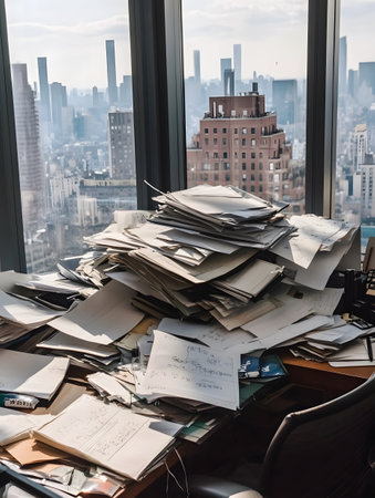 Messy office desk with piles of papers and documents in New York City