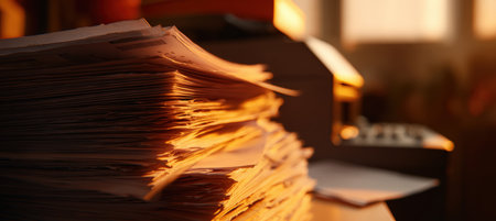 A stack of documents is illuminated by warm afternoon light, with a softly humming copier in the background. The image features a cinematic shallow depth of field.