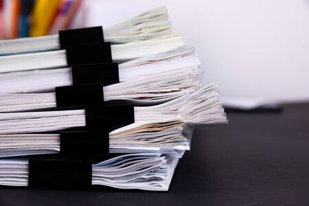 Mock up, stack of papers documents in archives files with paper clips on desk at offices, business concept.