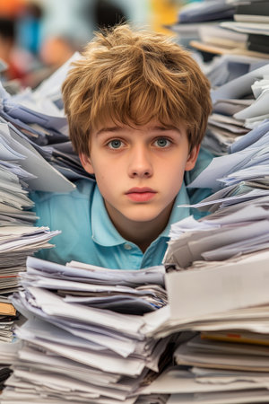 Overwhelmed Young Man Buried Under Mountain of Paperwork at Desk in Office, Natural Light