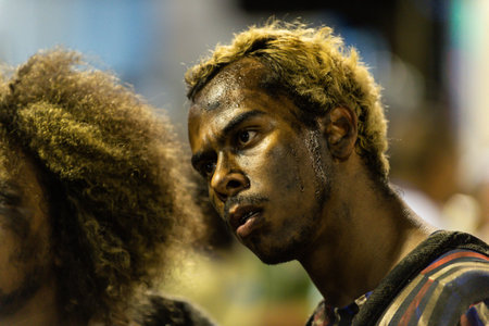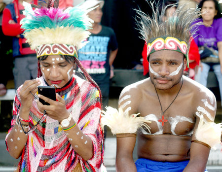 Hagen show, Papua New Guinea - circa August 2015: Young native men dressed in costumes and hats during Hagen show, Papua New Guinea. Documentary editorial.