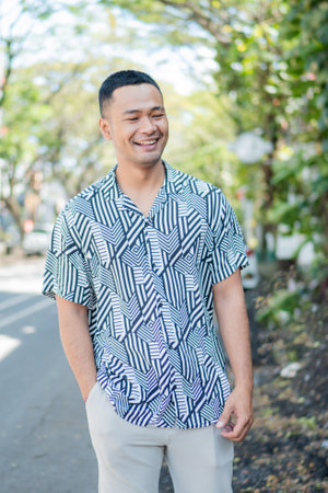 A young man in a stylish shirt enjoys a sunny day outdoors, surrounded by nature