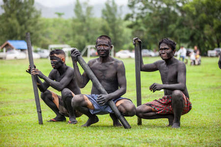 Carey Island, Selangor/Malaysia - Mar 17 2018: Malaysia's indigenous Mah Meri walk in oil palm plantation.