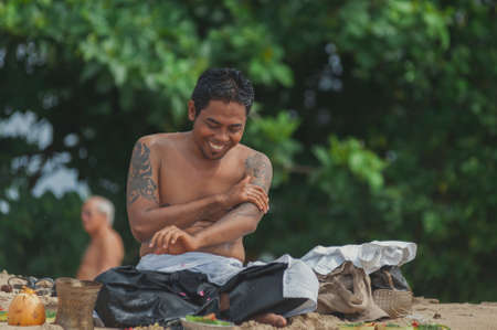 ARUTANGA, AITUTAKI ISLAND, COOK ISLAND - SEPTEMBER 30, 2018: Portrait of a cheerful man on a sandy beach. With selective focus