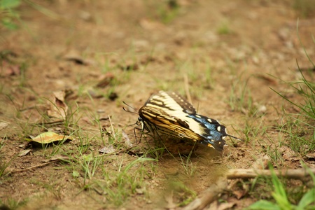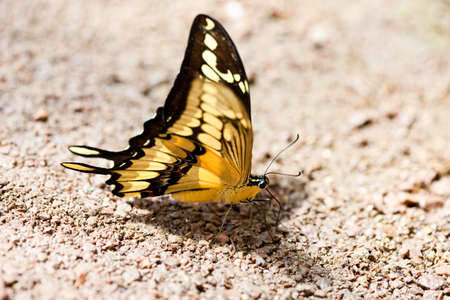 A chinese asian swallowtail butterfly, papilio xuthus, rests on the ground between feeding on flowers.