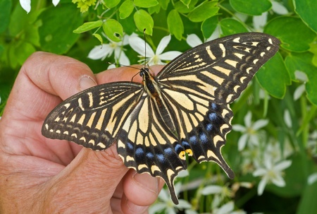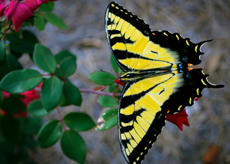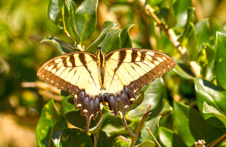 Close up of Western Tiger Swallowtail (Papilio rutulus) resting on a flower, San Francisco bay area, California