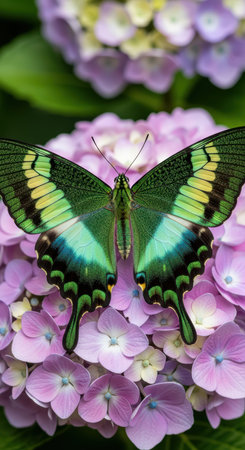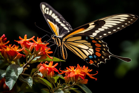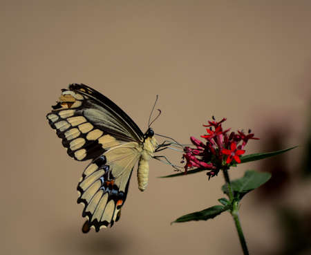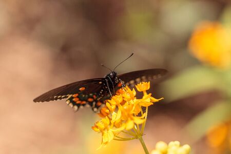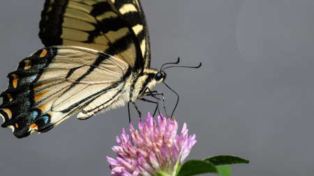 Close up of swallawtail butterfly perched on flowers and sucking nectar