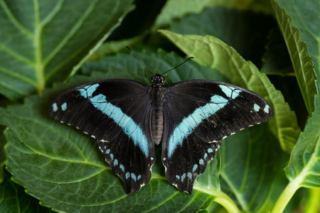 Black butterfly with shiny scales on the wings spread open.