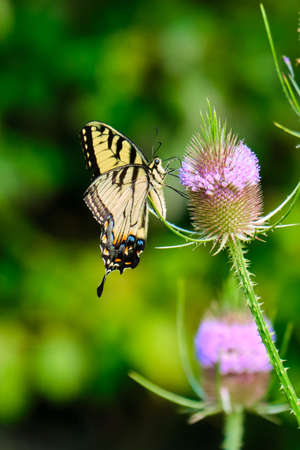 Western Tiger Swallowtail Butterfly sitting on purple flower with green background.