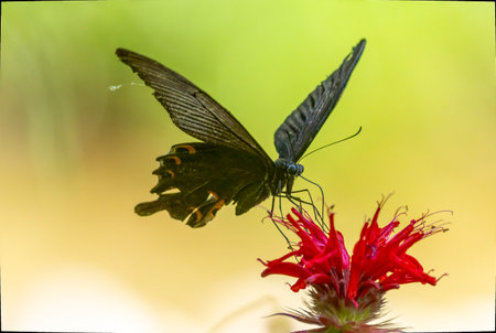 Crow Swallowtail sucking nectar from red monarda flower.