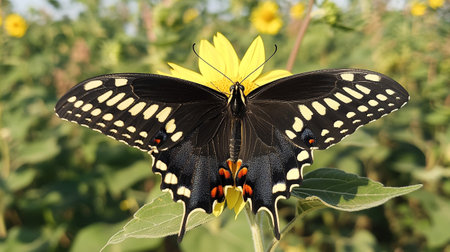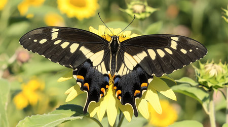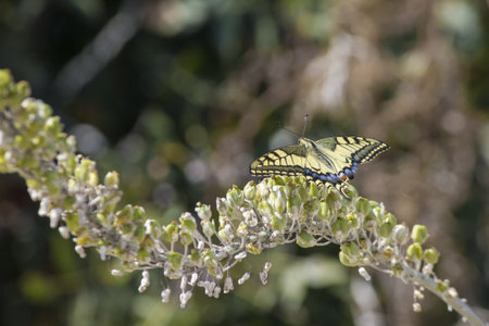 Anise swallowtail butterfly Papilio zelicaon perches on a flower in a botanical garden.