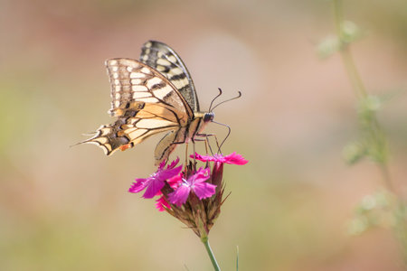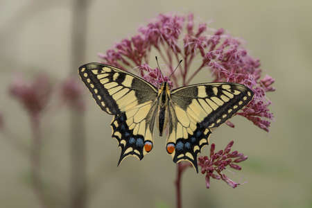 Old World Swallowtail or common yellow swallowtail (Papilio machaon) sitting on pink flower