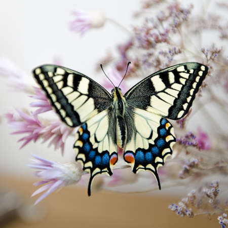 Papilio machaon. Swallowtail butterfly on bouquet of dry wildflowers