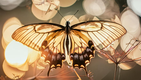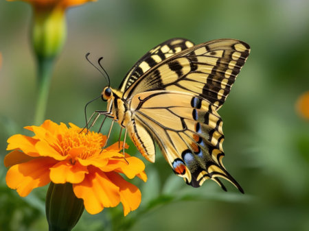 AI-generated A striking yellow and black butterfly rests on a delicate flower, its wings spread wide to reveal intricate patterns.
