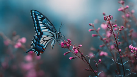 A breathtaking blue butterfly elegantly rests on soft pink flowers, showcasing remarkable detail in its wings and the vibrant floral backdrop. A serene nature scene perfect for wildlife lovers.