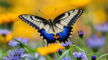 A stunning close-up of a vibrant butterfly displaying intricate blue and yellow patterns, gracefully resting among colorful flowers in a lively garden setting.