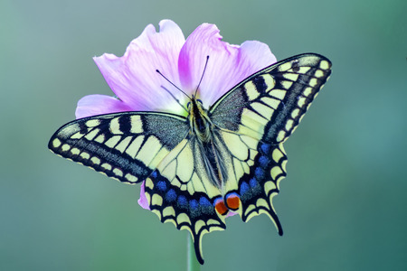Swallowtail butterfly sitting on the flower with green background