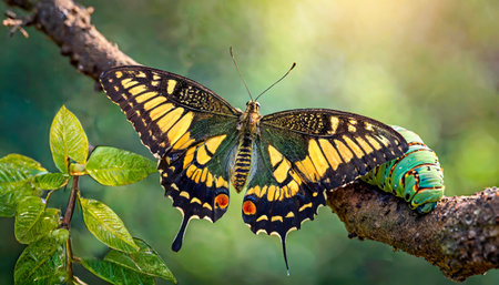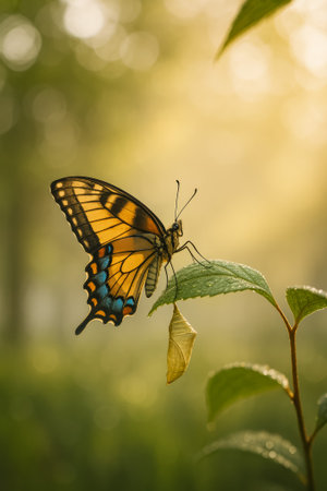 A vibrant butterfly resting on a leaf beside a chrysalis in a serene garden setting