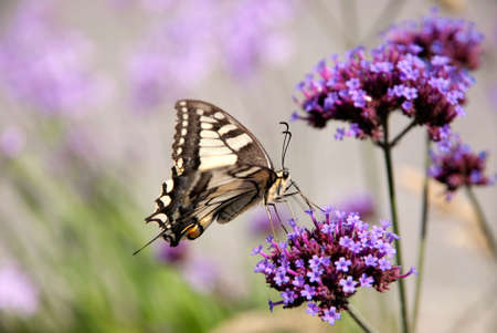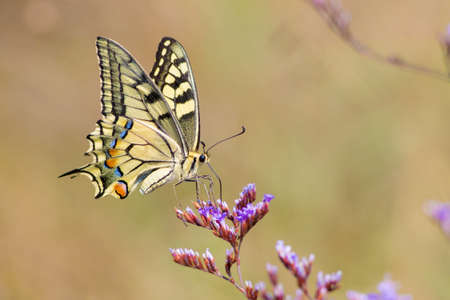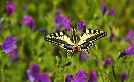 Bright colorful swallowtail butterfly Machaon on purple flowers in the garden.