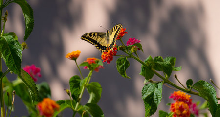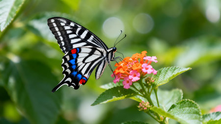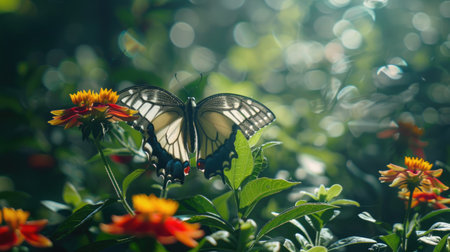 A delicate butterfly perched on a vibrant flower in a lush garden, basking in the sunlight