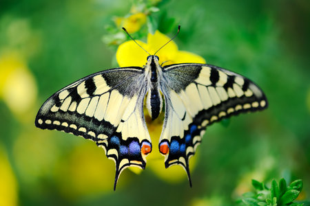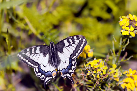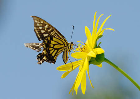 Macro shot of Beautiful Swallowtail Butterfly on yellow flower