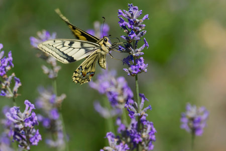Old World Swallowtail or common yellow swallowtail (Papilio machaon) sitting on lavender in Zurich, Switzerland